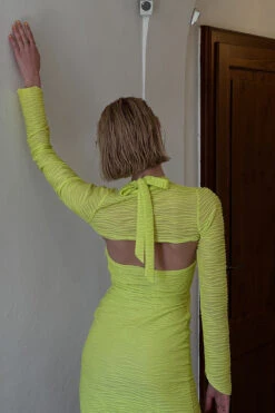 Cette robe midi est sans manches et a un modèle de bretelle à nouer dans le cou, un détail découpé sur la poitrine, une fermeture éclair latérale et une coupe boléro.