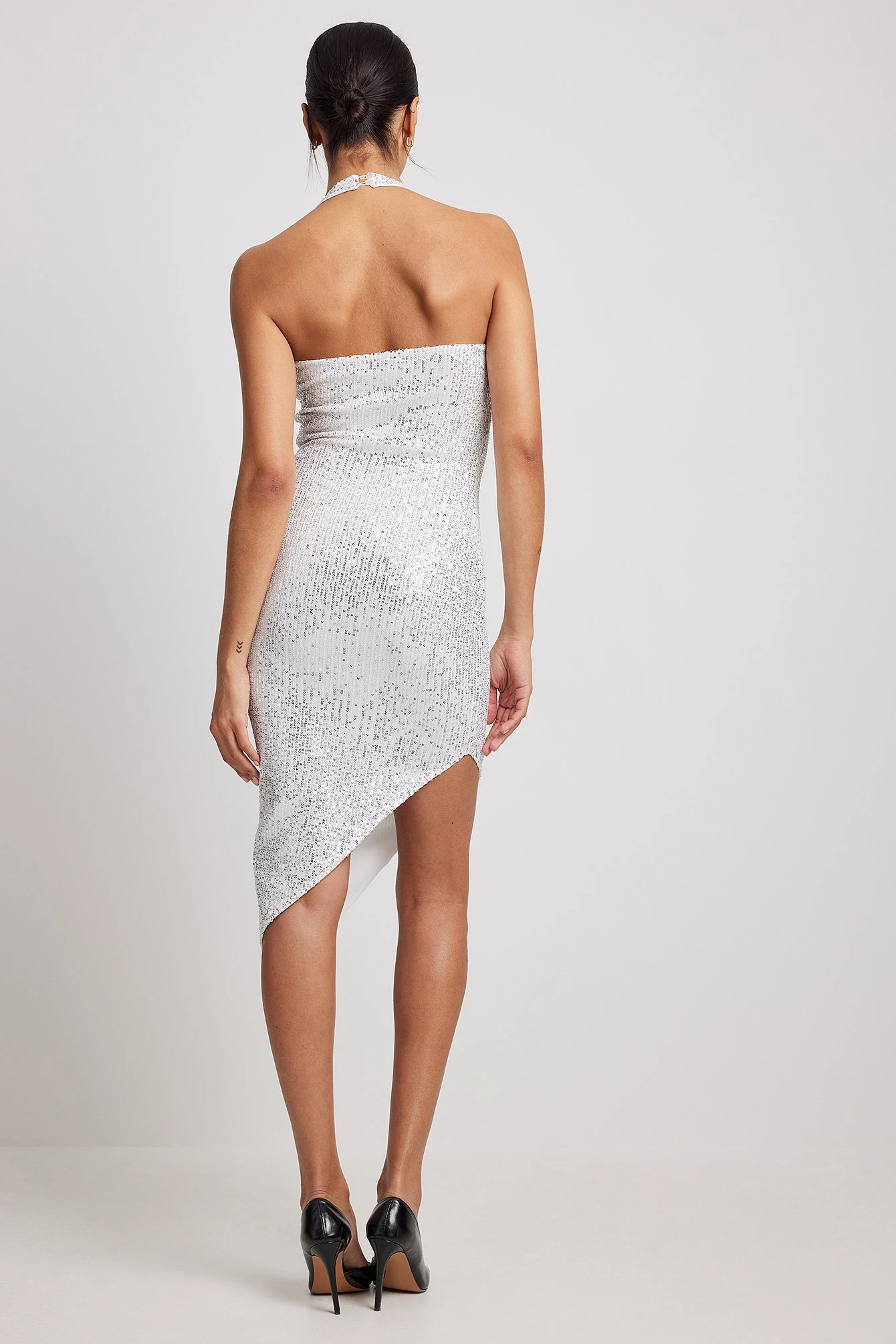 Cette robe midi est asymĂ©trique et faite en sequin et a un modĂšle de bretelle Ă nouer dans le cou avec bouton de fermeture Ă l’arriĂšre.