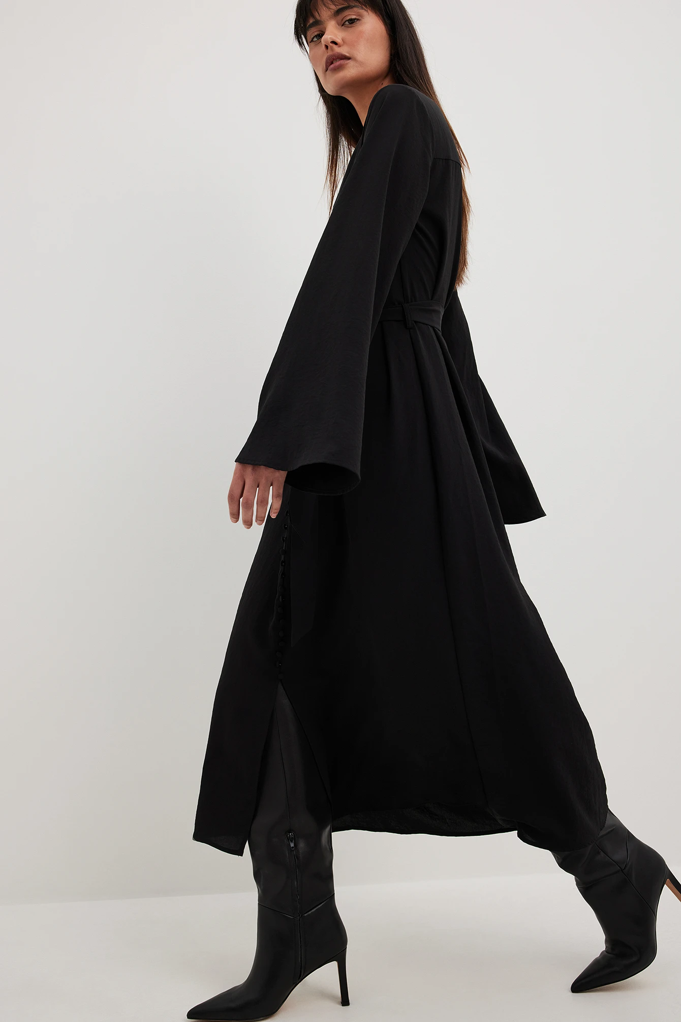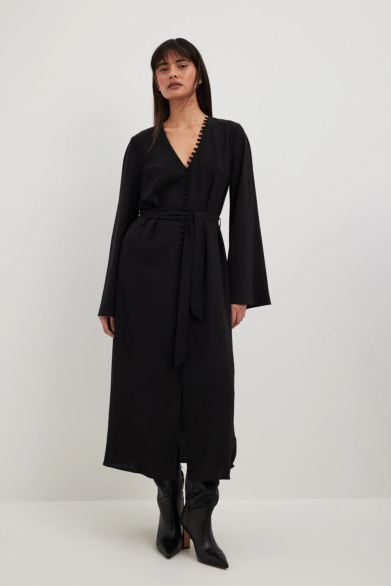 Cette robe est fluide et a une taille midi. Elle a un col en V avec boutons Ă l’avant et des manches pagode. Cette robe a une ceinture ajustable.