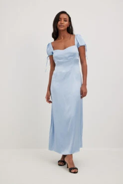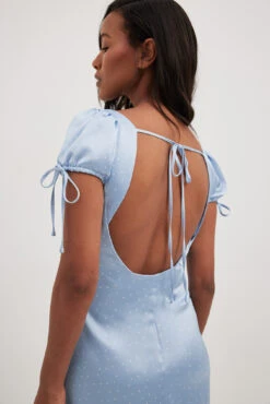 Cette robe midi a une matière avec toucher satin. Elle a une coupe fluide et des manches bouffantes avec cordons ajustables. Cette robe midi a un design à dos ouvert avec noeud à nouer et une fermeture éclair latérale cachée.