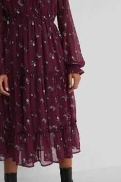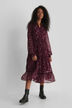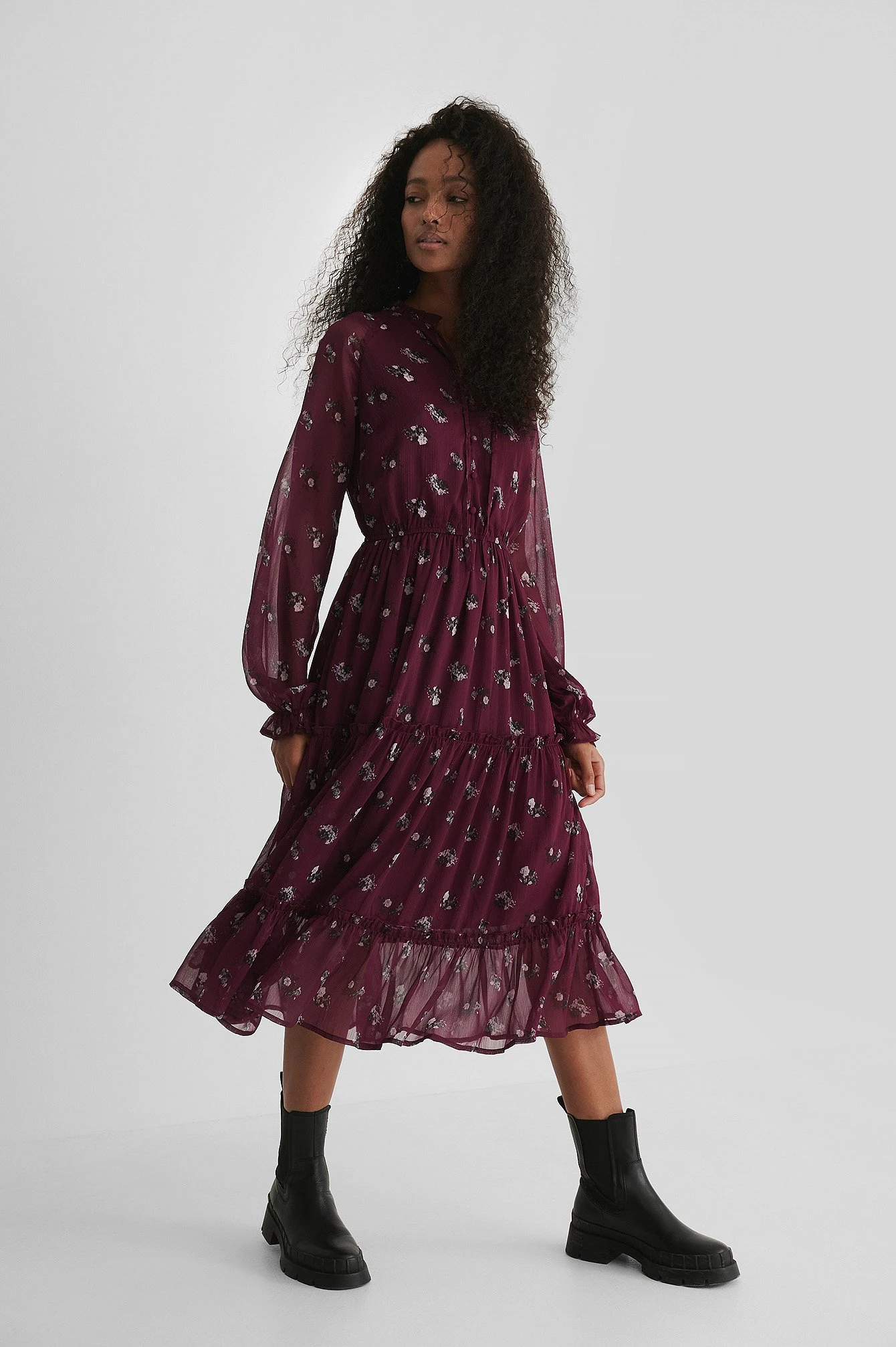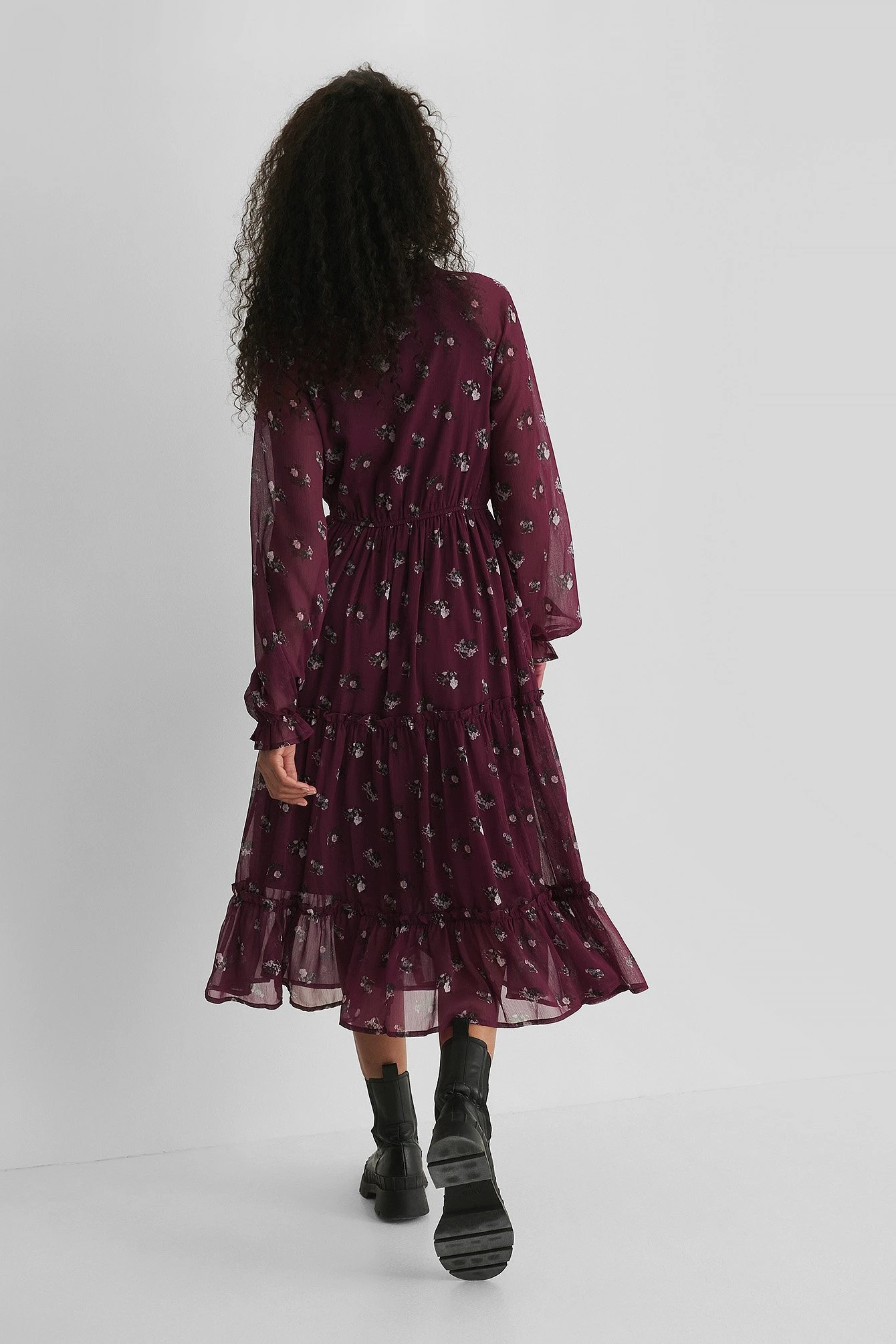 Cette robe a un ras-du-cou avec détails ruchés et ruban à nouer, un bouton de fermeture sur la moitié haute, des manches longues et transparentes avec manchettes élastiques et détails ruchés, une taille élastique avec détails froncés, une jupe fluide avec détails froncés à volant, une coupe décontractée, une taille midi et une doublure intérieure.