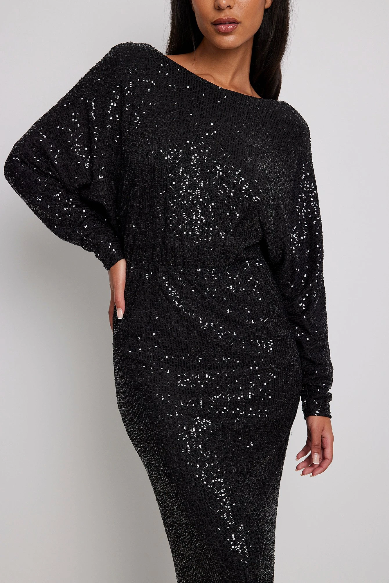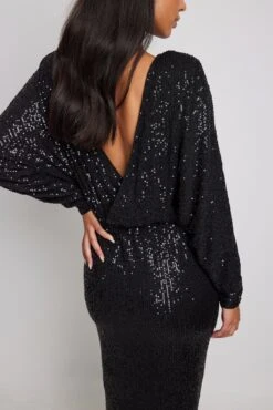 Cette robe à paillettes a un col arrondi, des manches longues avec épaulettes, un décolleté dos, une taille marquée et une taille midi.