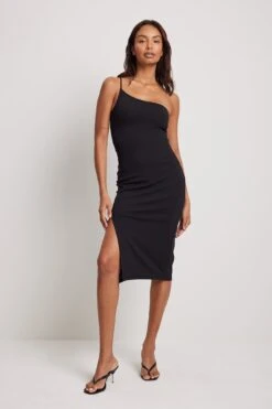 Cette robe midi a un style à une épaule avec une bretelle fine et non ajustable, une longue fente, une coupe moulante et une matière élastique.