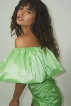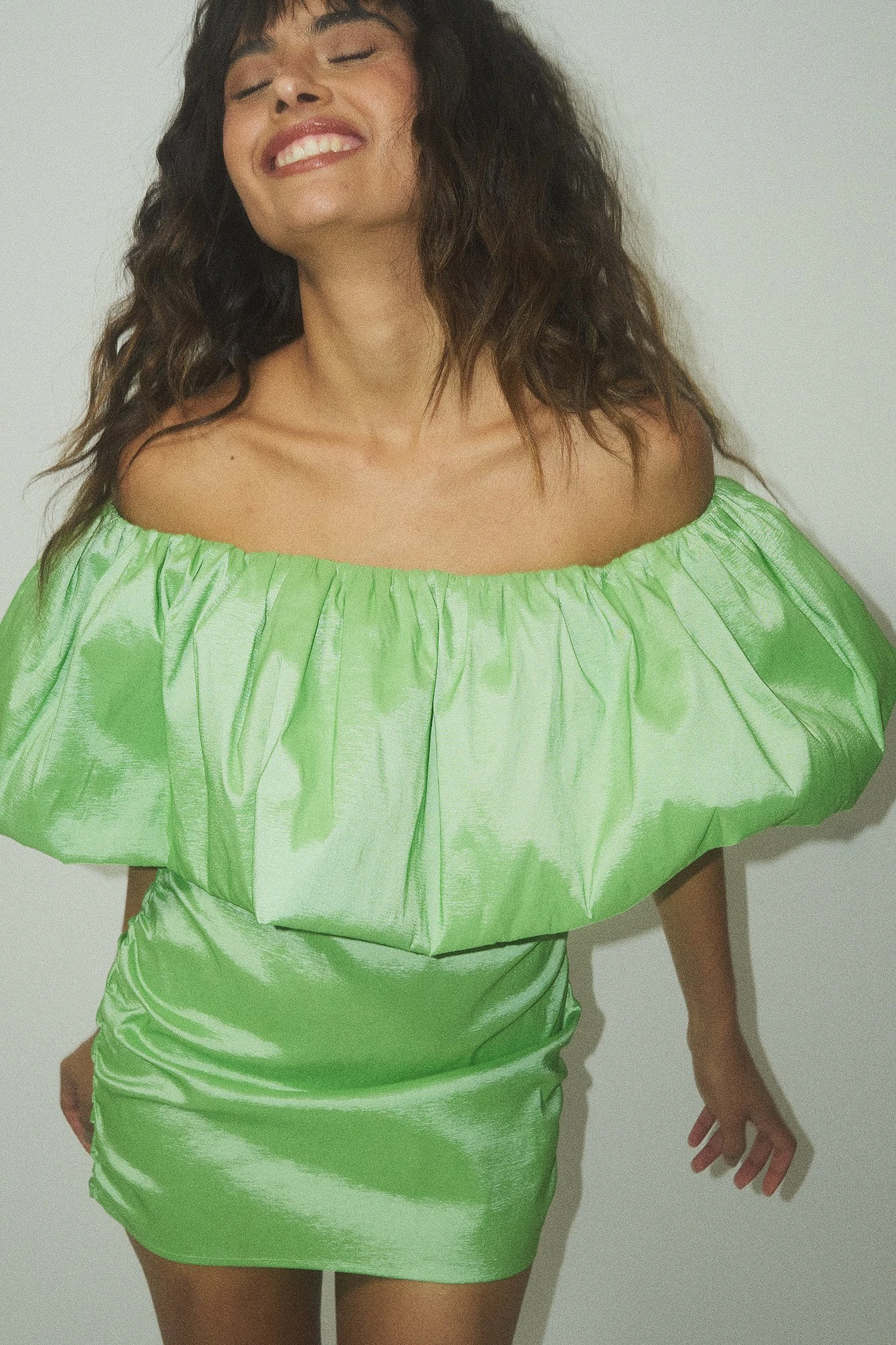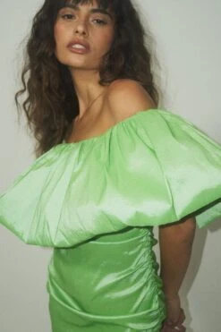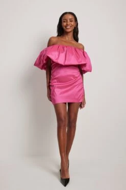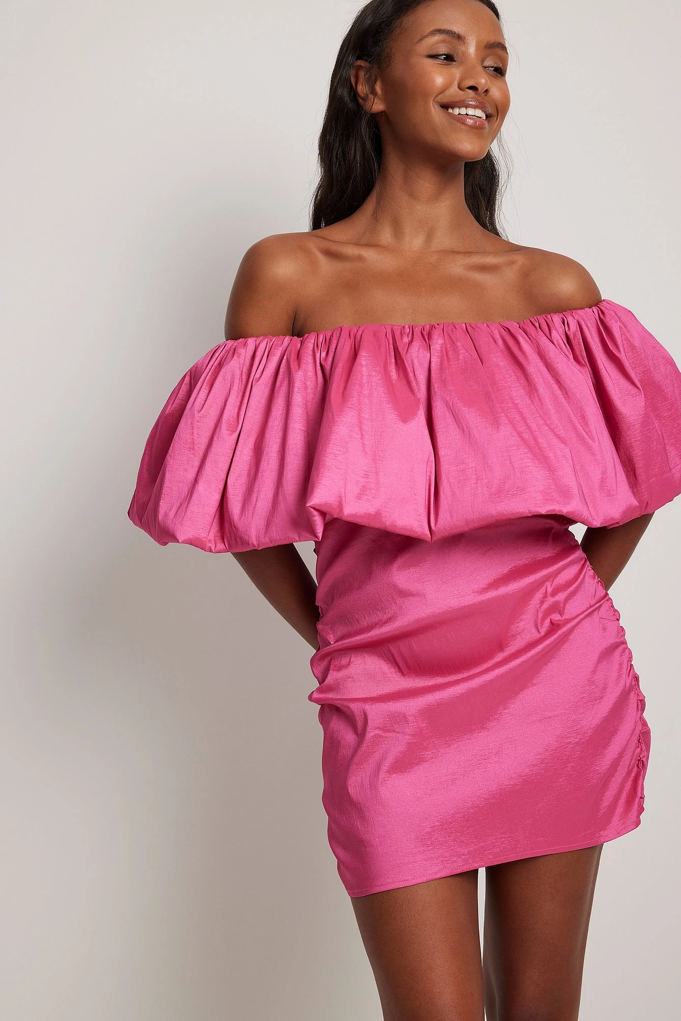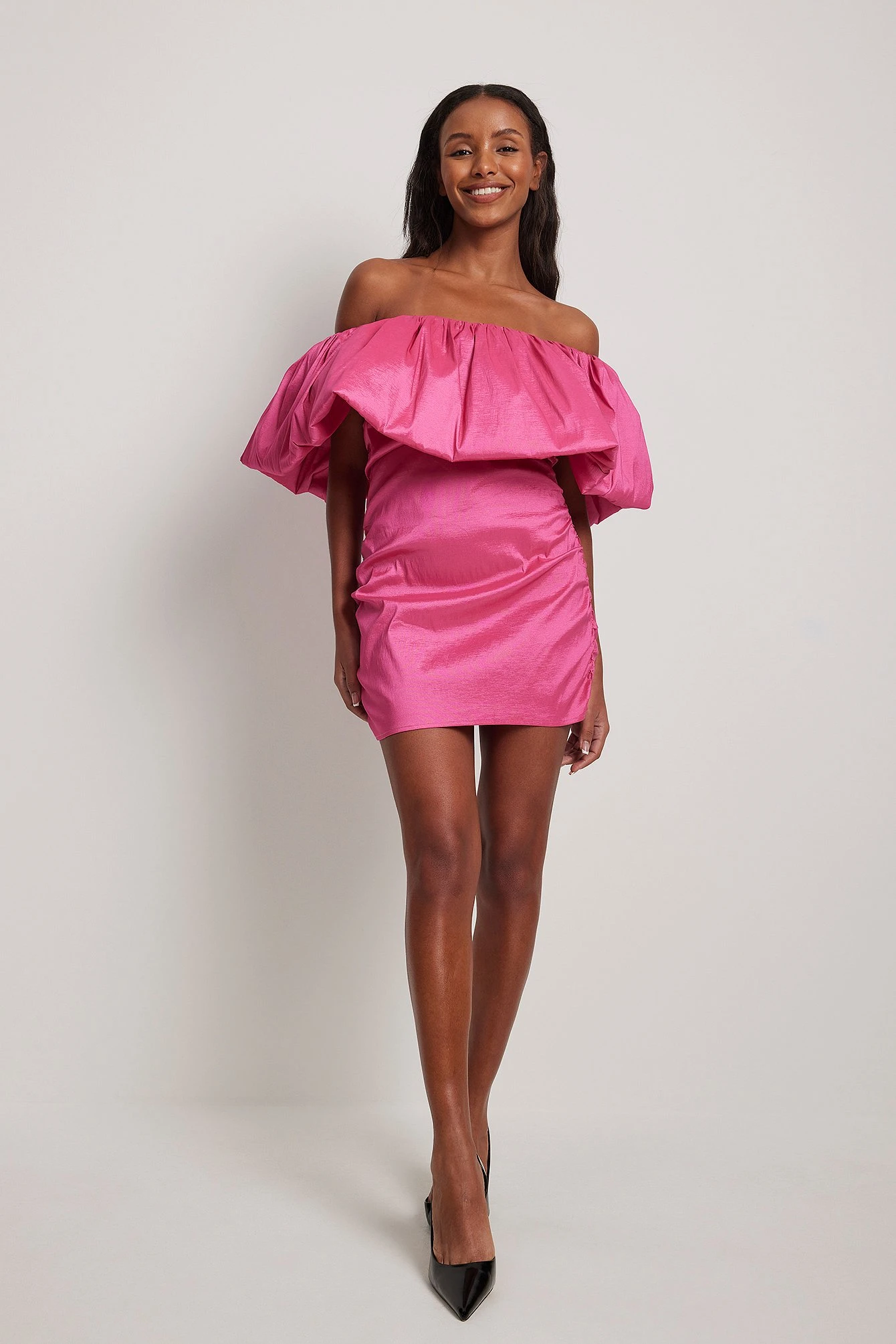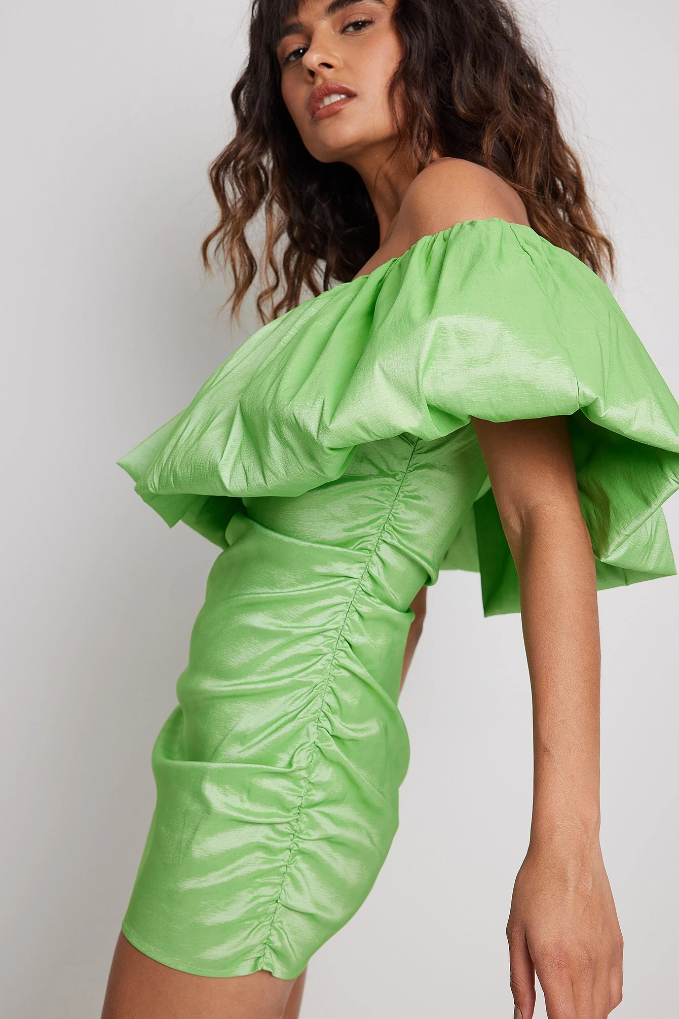 Cette robe a un design à une épaule réglable avec couche bouffante, une fermeture éclair et crochet sur le côté, une taille courte et des froncements sur les côtés.