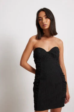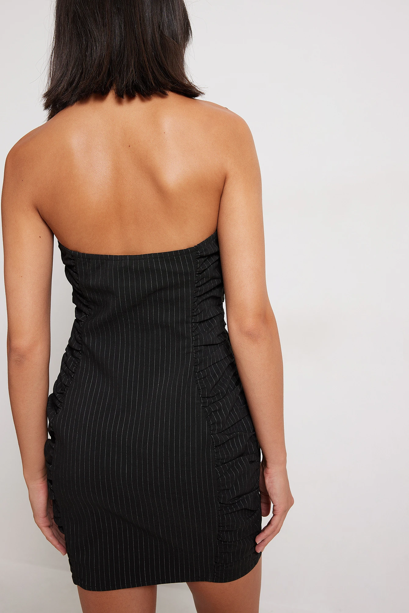 Cette robe courte a un style bandeau, un bonnet à armature, des détails froncés, une fermeture éclair latérale, un detail rayé fin et une matière élastique.