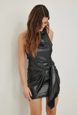 Cette robe a une encolure drapée et haute, un bouton de fermeture à l’arrière de la nuque, un design sans manches, une fermeture éclair à l’arrière, un détail noué à la taille et une taille courte.