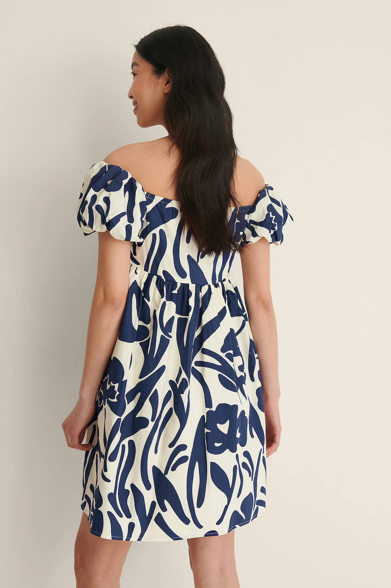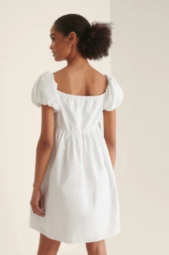 Cette robe a un col en forme de coeur avec garnitures intérieures en silicone. Elle a des manches courtes bouffantes avec manchettes élastiques et un froissement sous la poitrine. Cette robe a une taille courte avec doublure intérieure.
