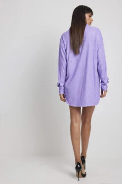 Cette robe courte est brillante et Ă©lastique et a une couture latĂ©rale froncĂ©e et une bretelle Ă l’arrière.