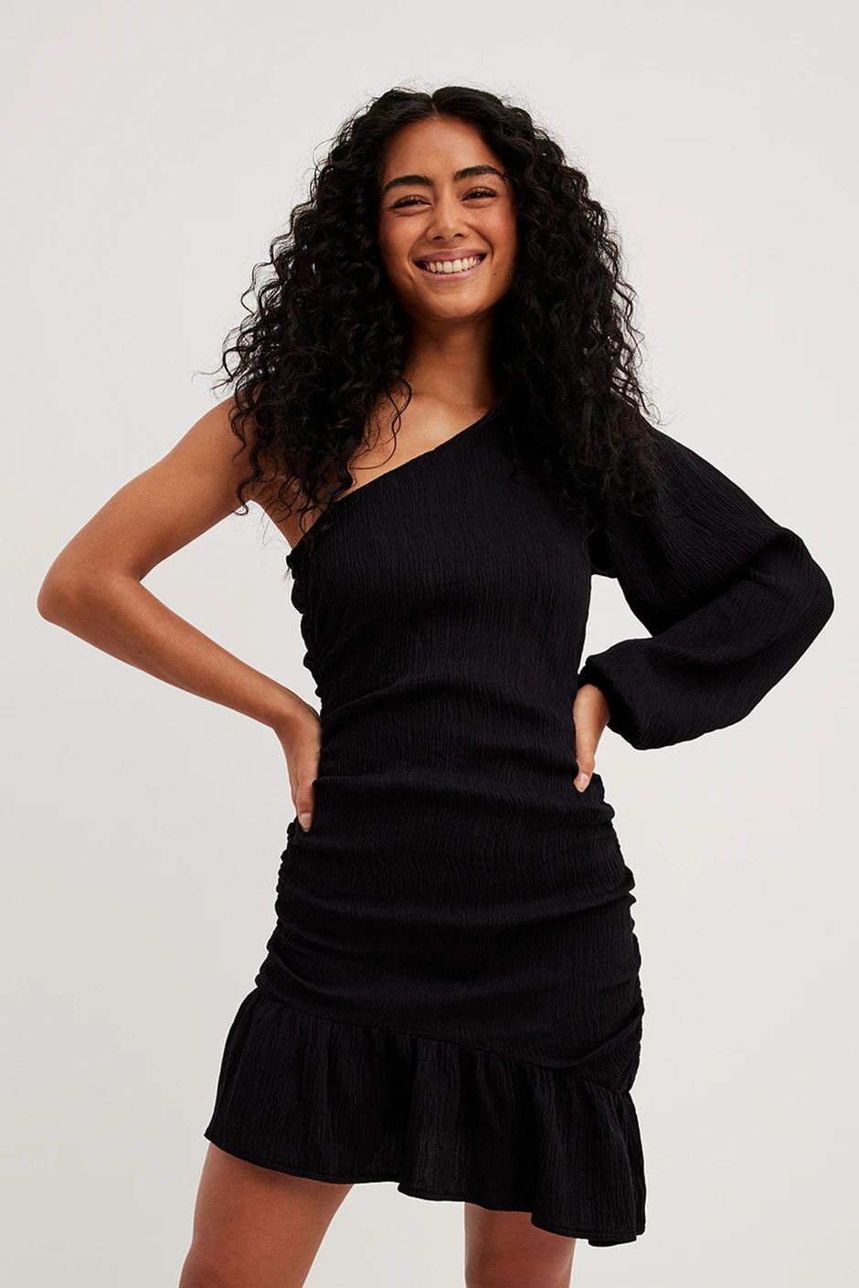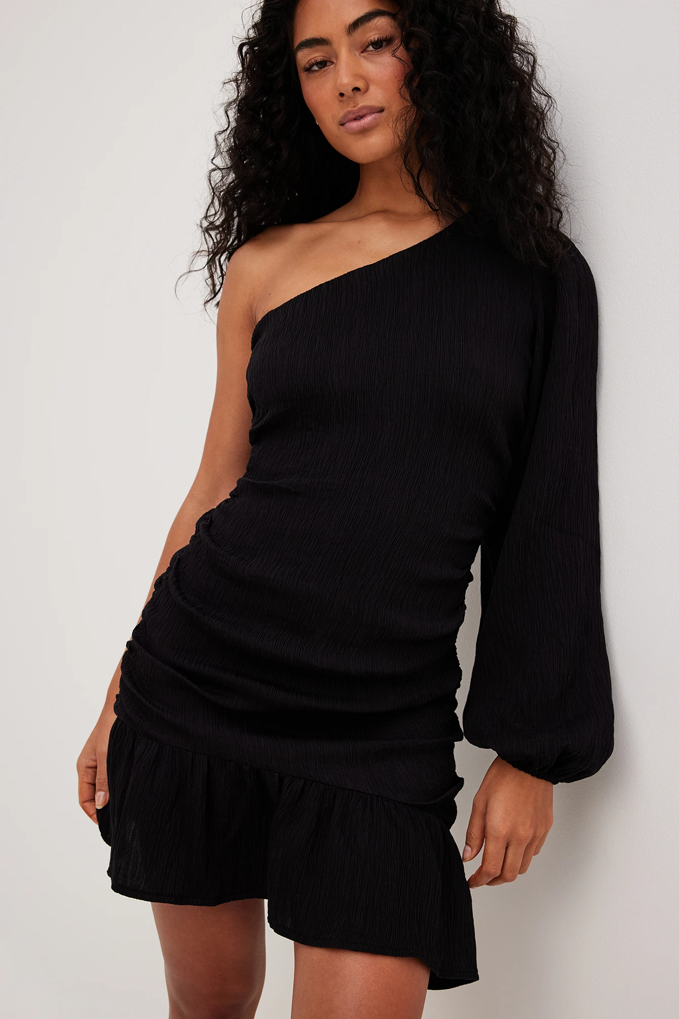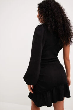 Cette robe courte est ajustée et a une matière texturée et élastique. Elle a un design à une épaule et une manche ballon avec manchette élastique. Cette robe courte a des fronces sur les côtés, une petite fermeture éclair et crochet de fermeture sur le côté et un détail volanté ruché et asymétrique sur l’ourlet.