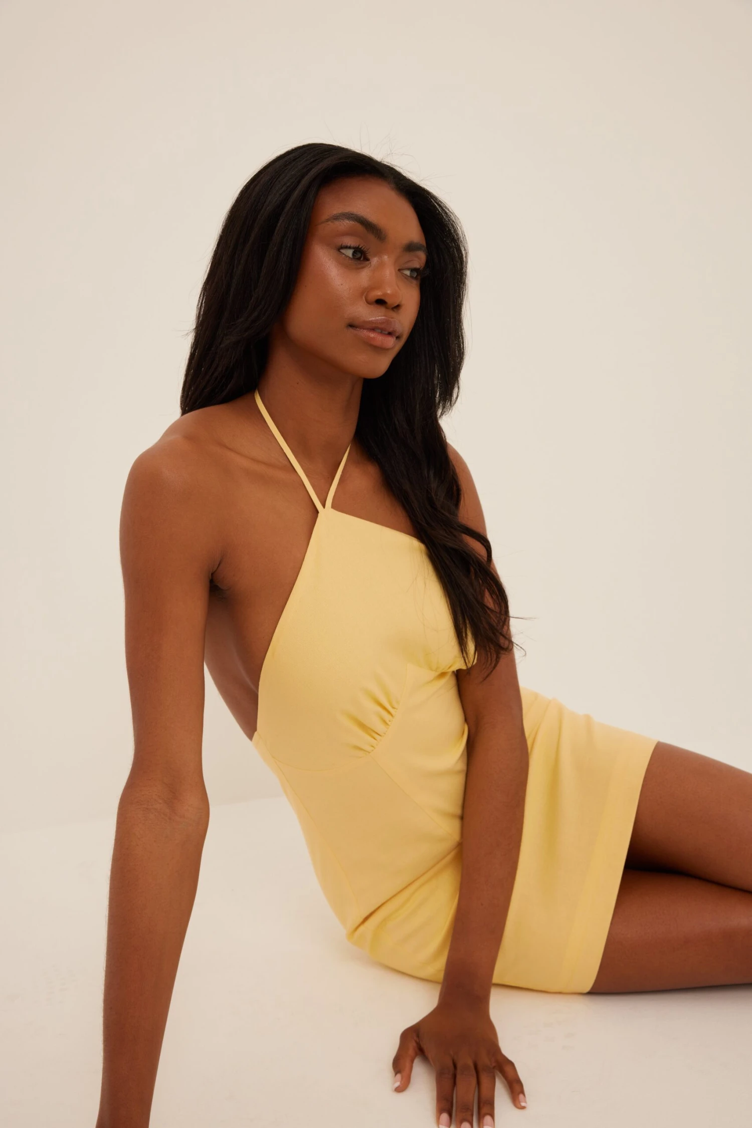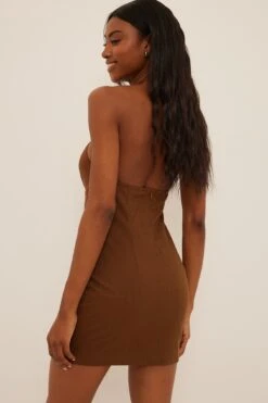 Cette robe courte a une attache de tour de cou, une fermeture au dos et une doublure à l’intérieur.