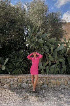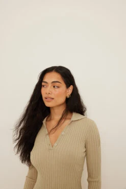 Cette robe courte est tricotée et à nervures et a un col classique avec boutons, des manches longues avec détail fendu sur les manchettes, des manchettes colorées et un ourlet coloré.