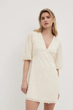 Cette robe courte a une matière texturée. Elle a une coupe fluide et un col en V. Cette robe courte a des manches courtes bouffantes avec manchettes élastiques, une fermeture éclair latérale cachée et une doublure.