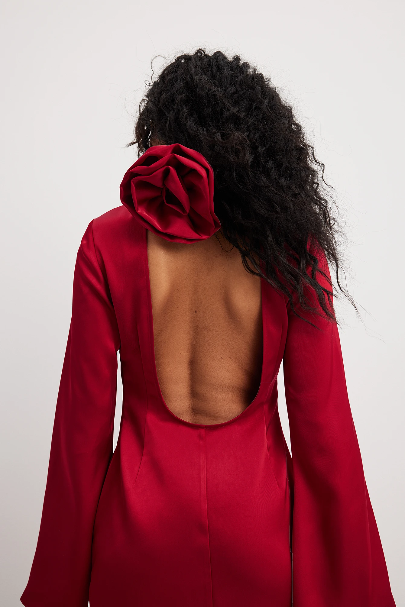 Cette robe courte a une coupe fluide. Elle a un toucher satin et un col haut avec bouton de fermeture. Cette robe courte a une longue manche large, un design à dos ouvert, une fermeture éclair latérale et un embellisement avec pince avec rose.