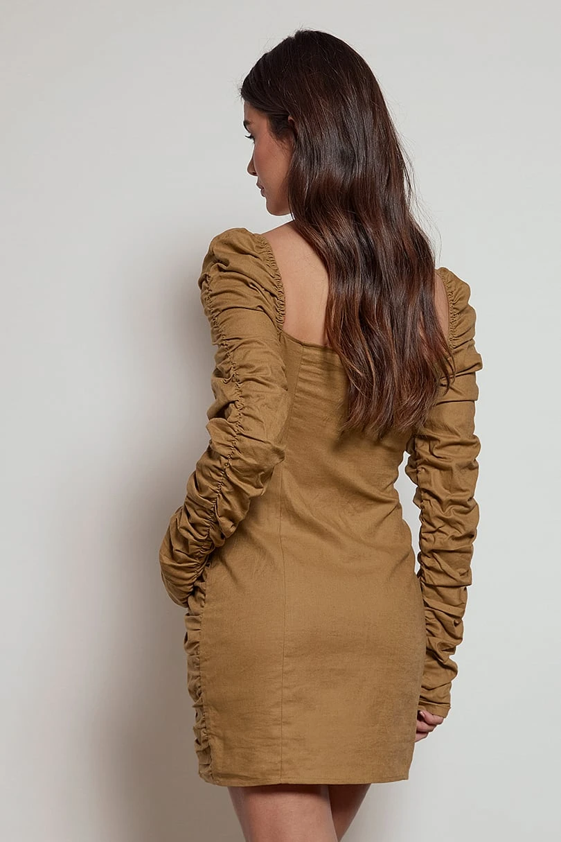Cette robe courte a un décolleté en coeur avec détails de bonnet et des manches longues avec détails froncés.