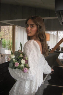 Cette robe courte a un décolleté en coeur avec détails froncés sur la poitrine. Elle a des manches longues bouffantes et une matière structurée.