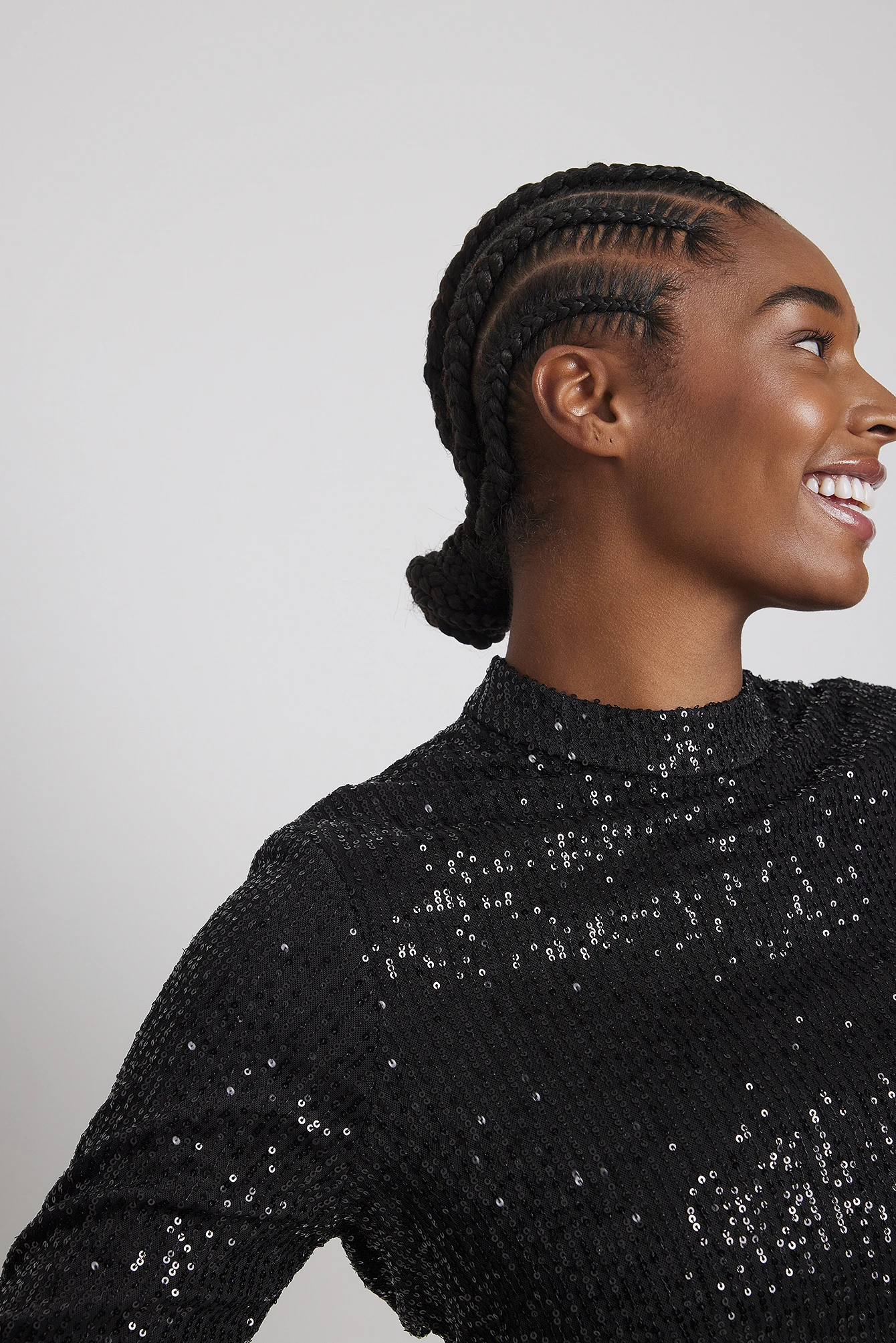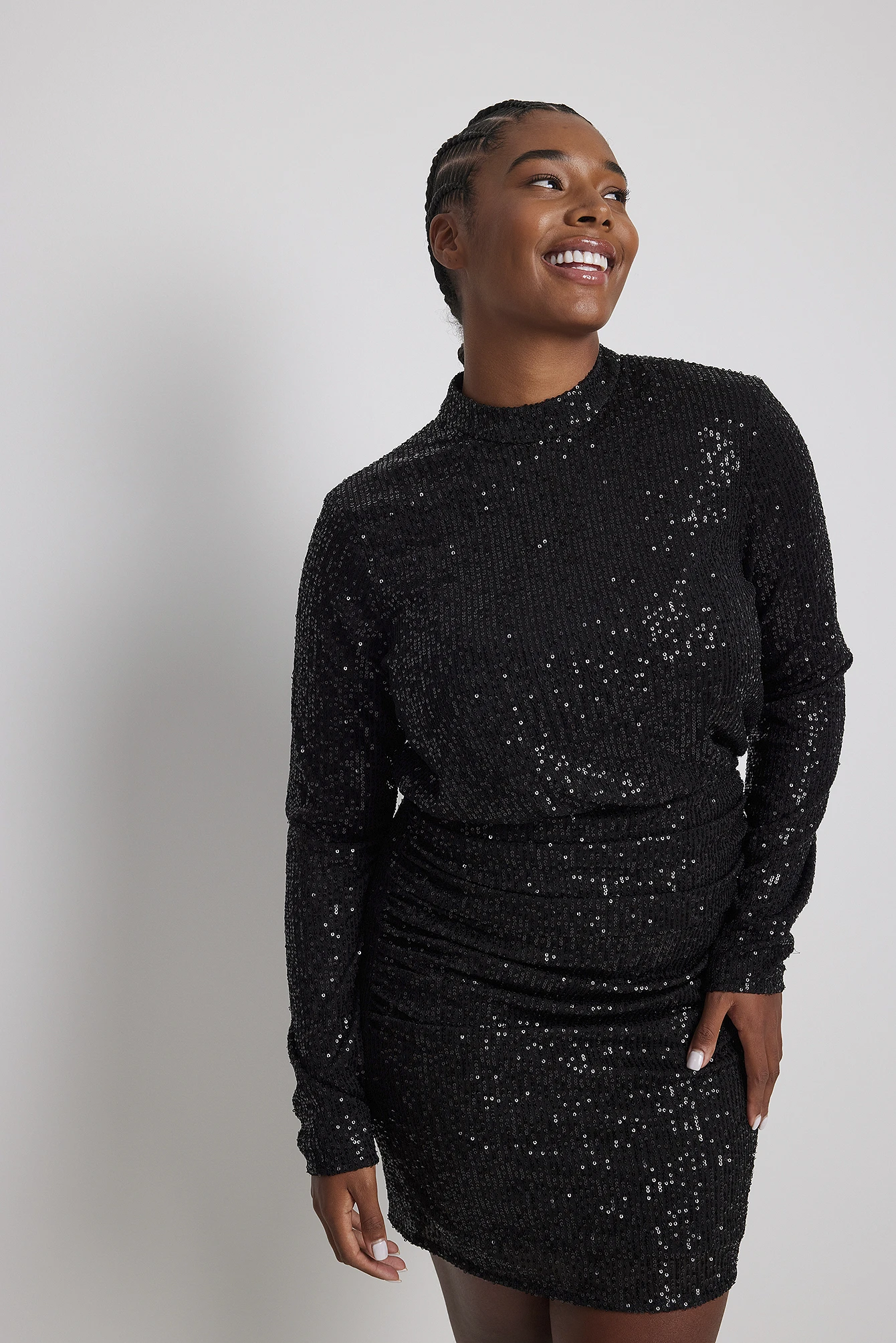 Cette robe courte a un col haut, des manches longues, une fermeture au dos cachée, des détails froncés sur les côtés et une matière sequin.