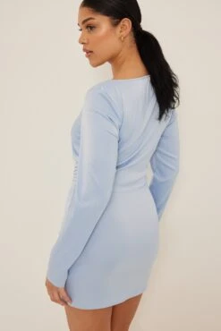 Cette robe courte est faite en satin et a un col carré, des manches longues, une ceinture froncée et une fermeture éclair latérale.