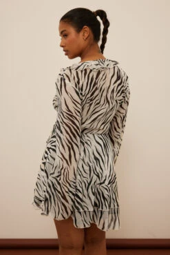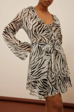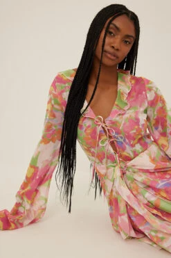 Cette robe a un col en V avec bordures froissĂ©es et noeuds de cravate Ă l’avant, des manches longues larges, une taille courte avec couches fluides et transparentes, une doublure intĂ©rieure et une matière transparente sur le haut.