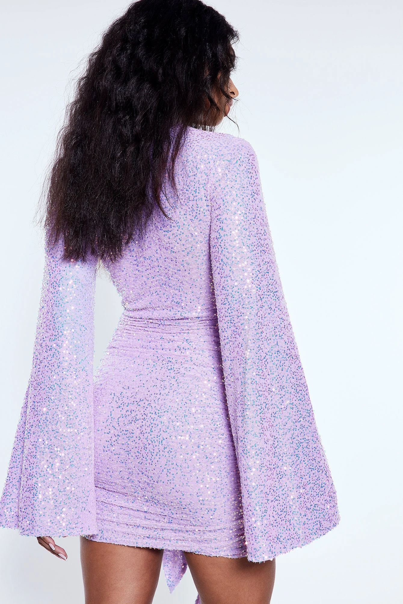 Cette robe courte est faite en sequin et a des manches longues avec une coupe Ă©vasĂ©e, un col en V, un dĂ©tail de noeud ajustable Ă l’avant et un dĂ©tail drapĂ© sur les cĂ´tĂ©s.