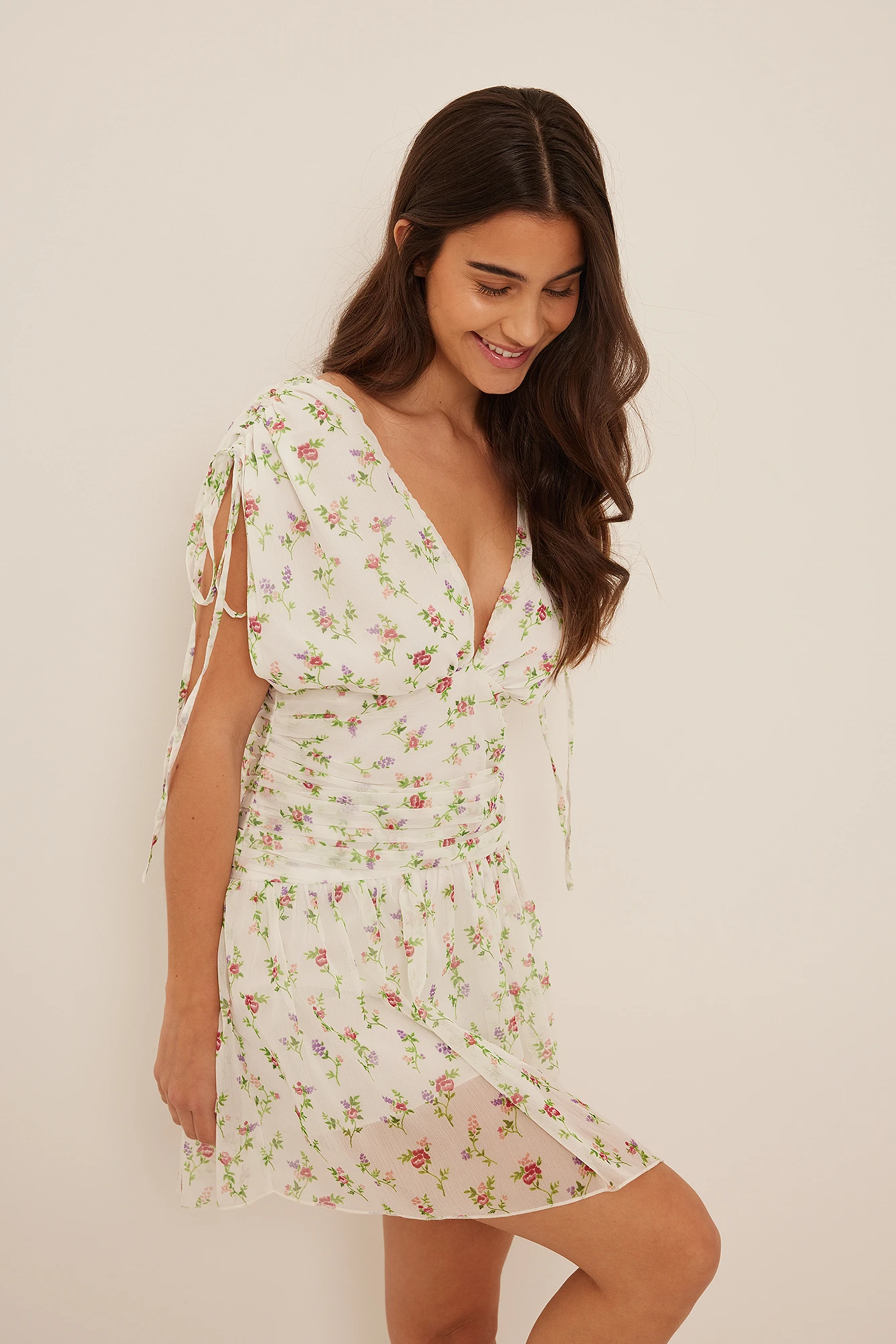Cette robe courte a des dĂ©tails Ă cordons coulissants aux Ă©paules, un design Ă plis Ă la taille, une fermeture Ă©clair latĂ©rale et une doublure Ă l’intĂ©rieur.
