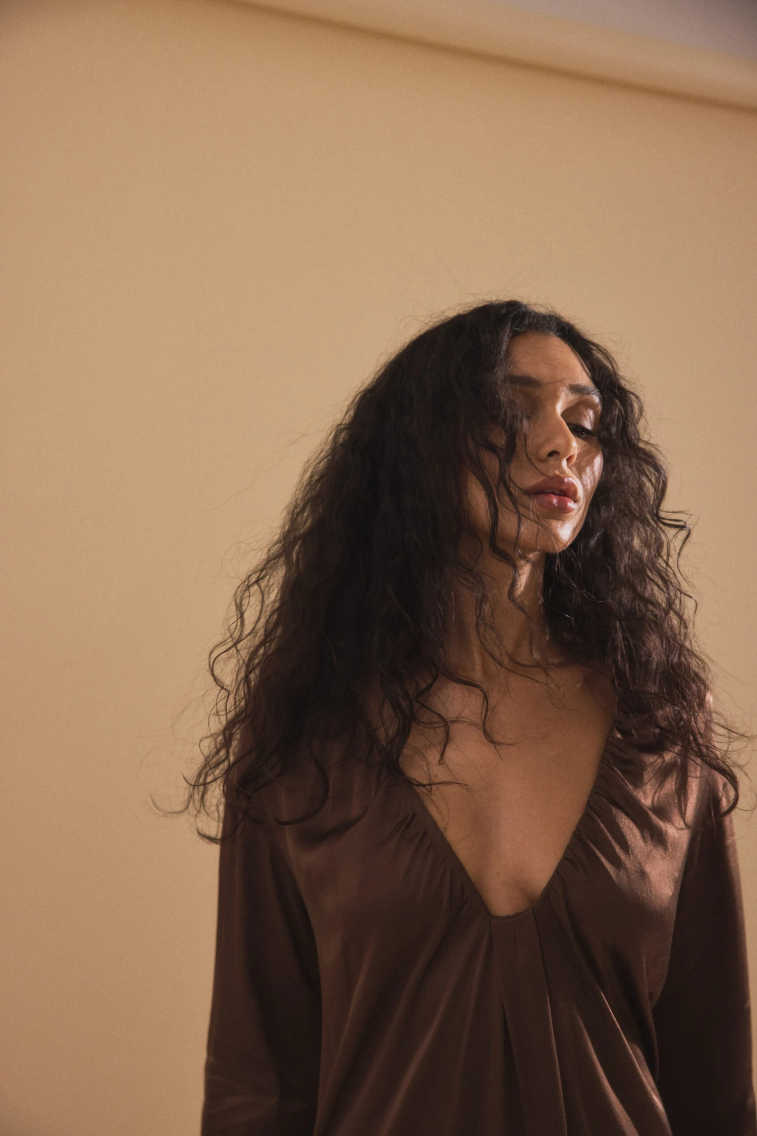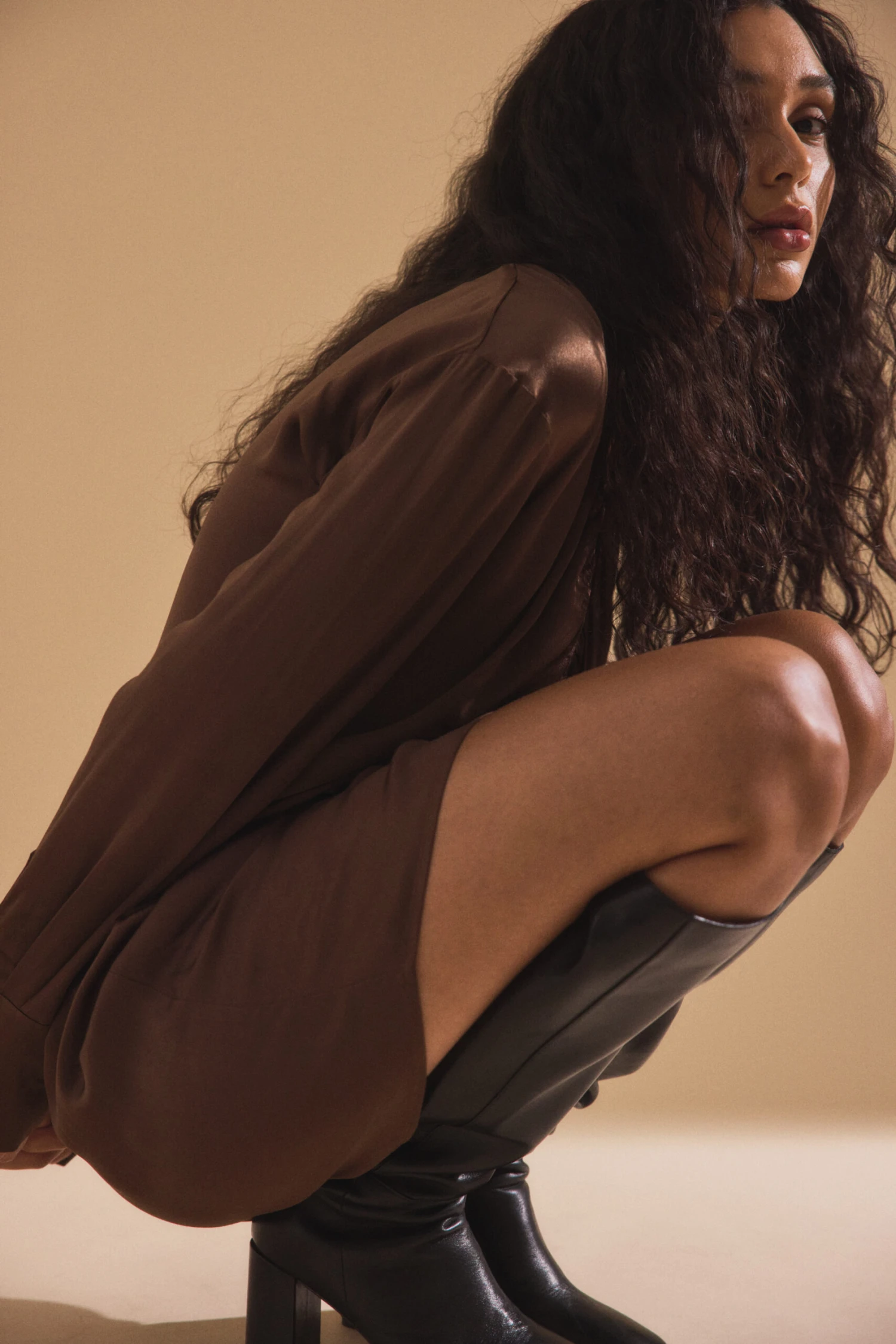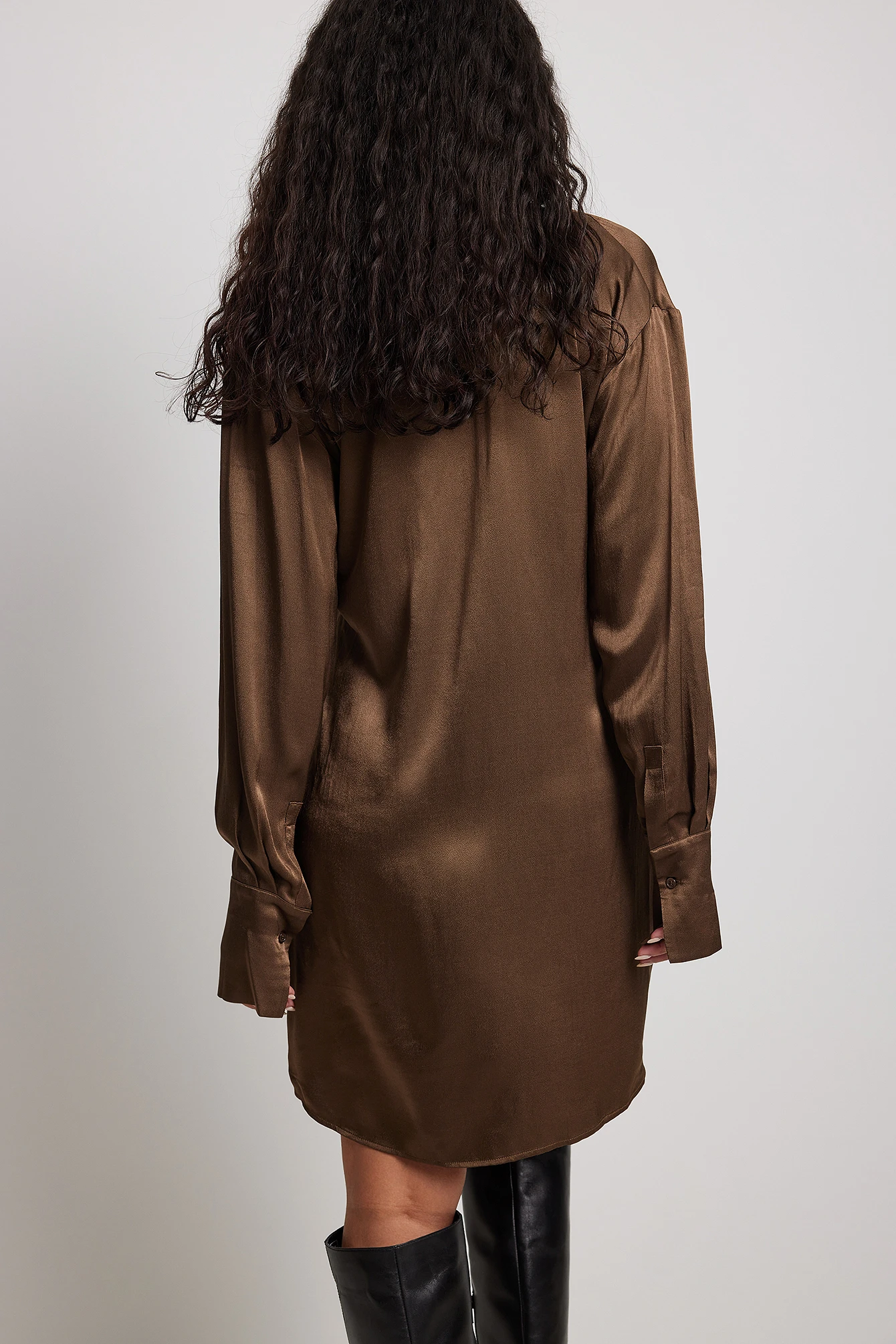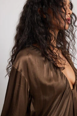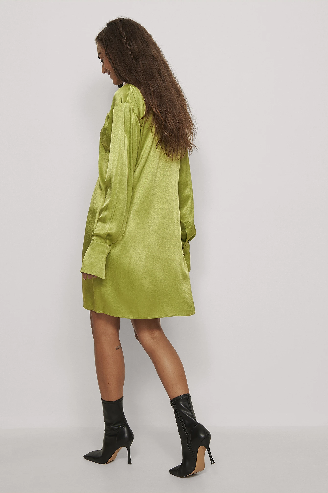 Cette robe courte a du tissu en satin, un col en V avec fronce et des manches longues avec manchettes simples.