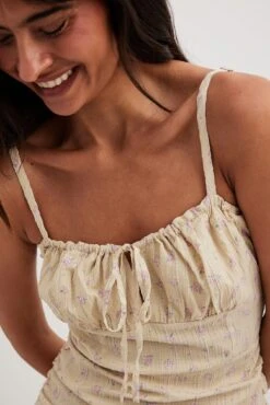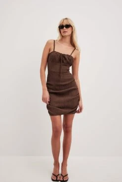 Cette robe courte est élastique et a une matière structurée à nervures. Elle a des bretelles fines et réglables et un cordon ajustable sur la poitrine. Notre robe courte a des froncements sur les côtés et à l’arrière et une fermeture éclair à l’arrière.