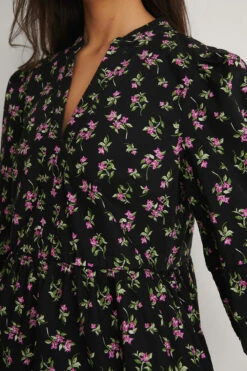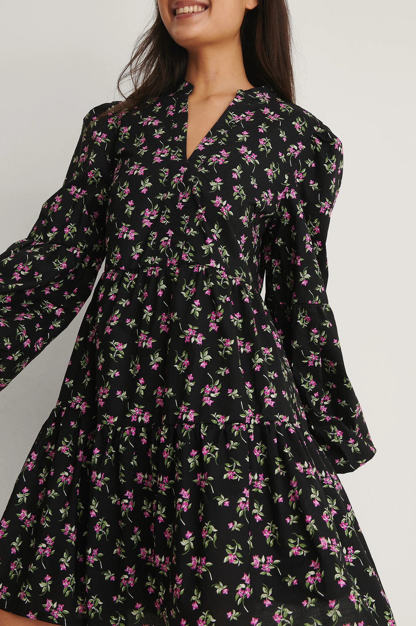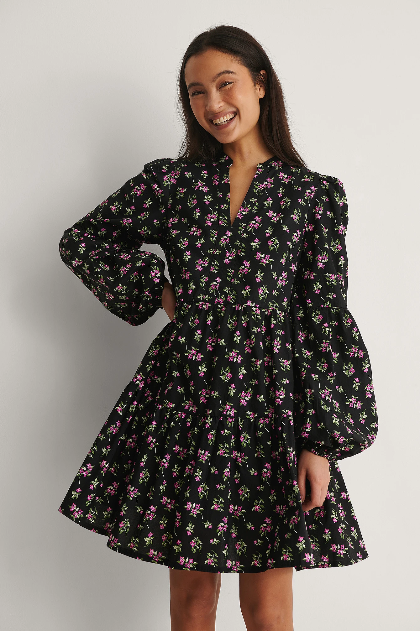 Cette robe courte a un col en V, des manches longues bouffantes, des manchettes élastiques et un design en trapèze.