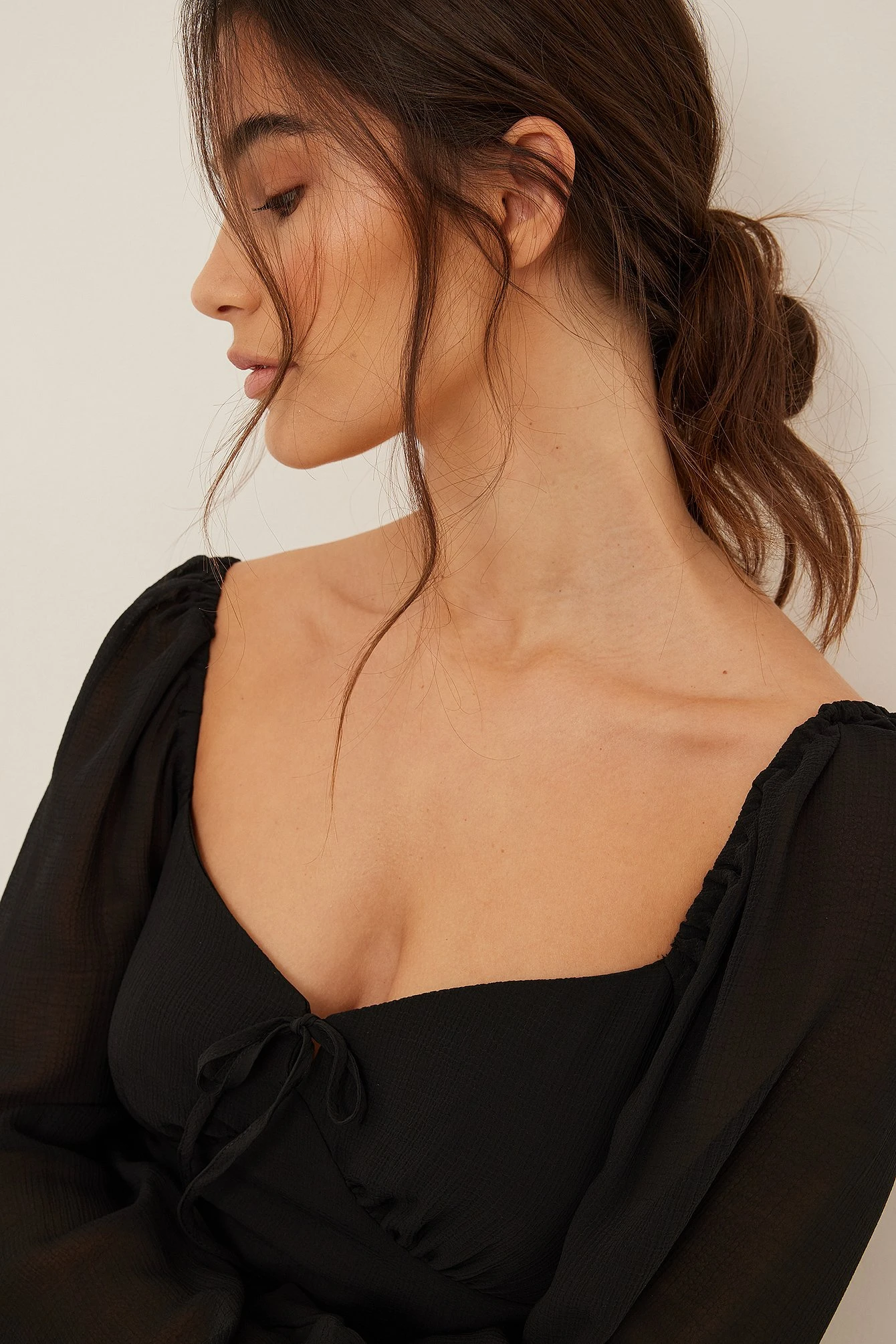 Cette robe courte a un détail auto-sérré sur la poitrine, des manches bouffantes avec froissements, une fermeture éclair latérale et une jupe trapèze.