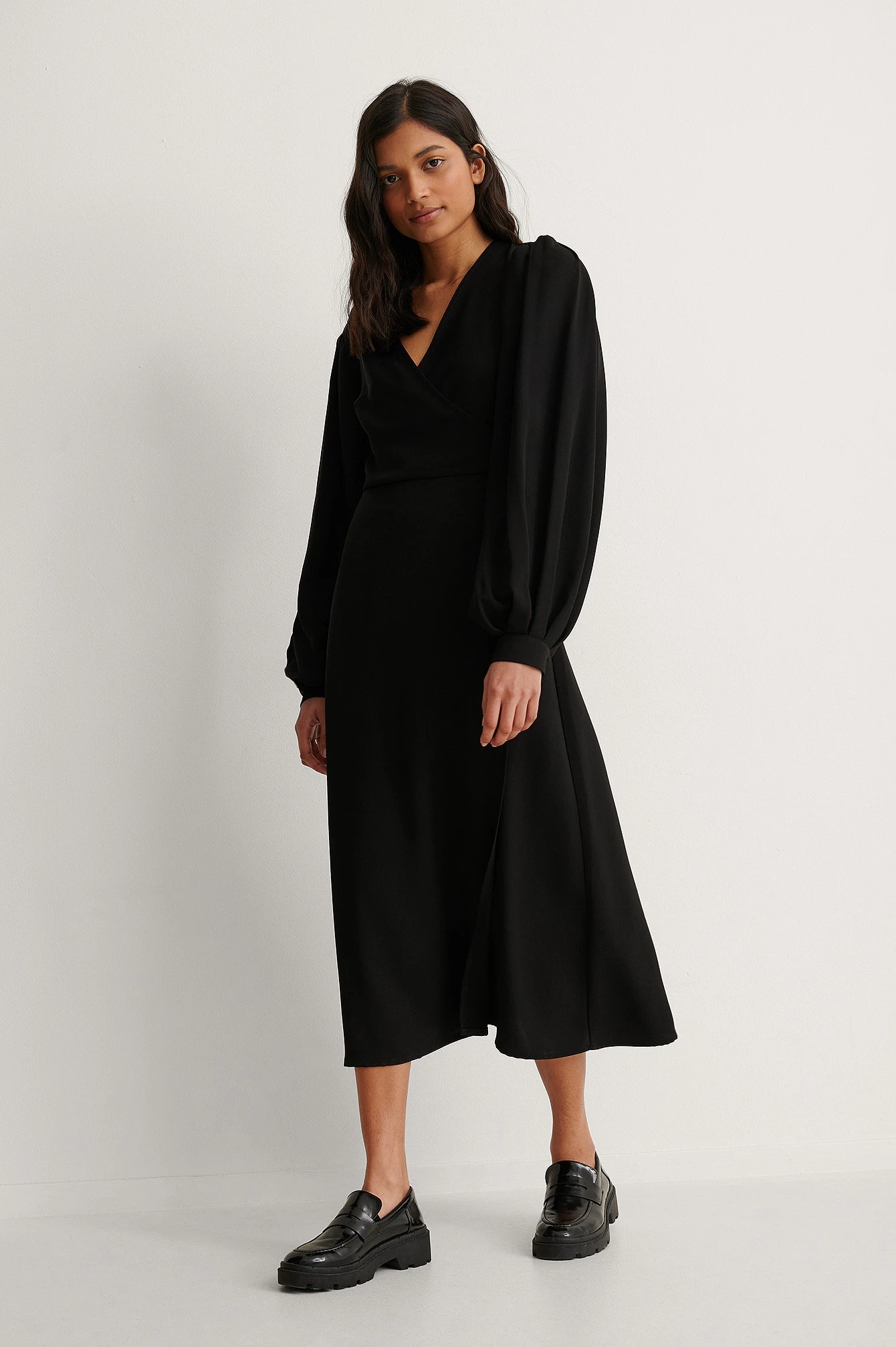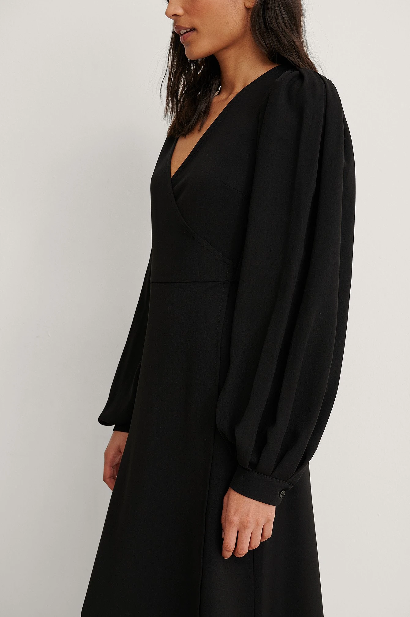 Cette robe a des manches longues bouffantes avec un bouton de fermeture, deux poches, un design enveloppant avec ceinture ajustable et une taille midi.