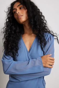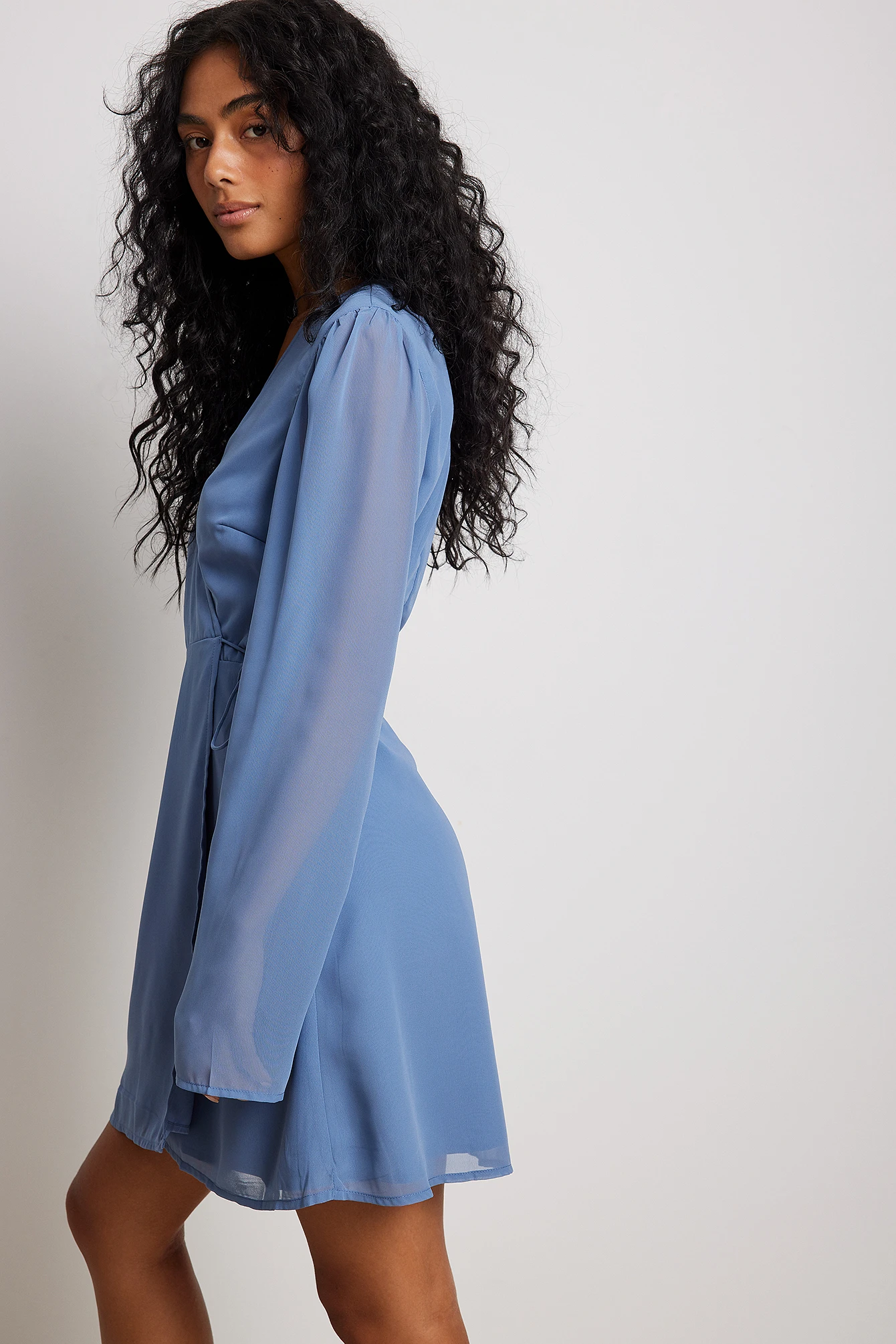 Cette robe courte a des manches longues, un design enveloppant avec col en V et détail auto-sérré et une coupe fluide.
