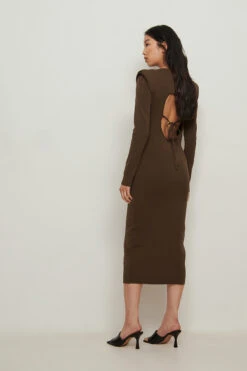 Cette robe est tricotée et a un col arrondi, des épaules rembourrées, un design à dos ouvert avec cordon ajustable et une coupe moulante.