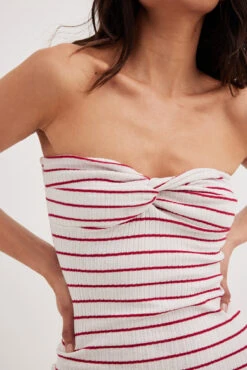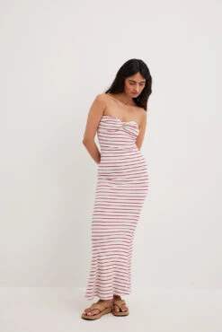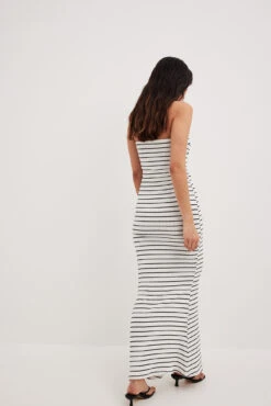 Cette robe longue est ajustĂ©e et a un tricot Ă cĂ´tes et une coupe avec une coupe trapèze. Elle a un design sans manches avec dĂ©tail de torsion Ă l’avant et garniture intĂ©rieure en silicone Ă l’arrière.