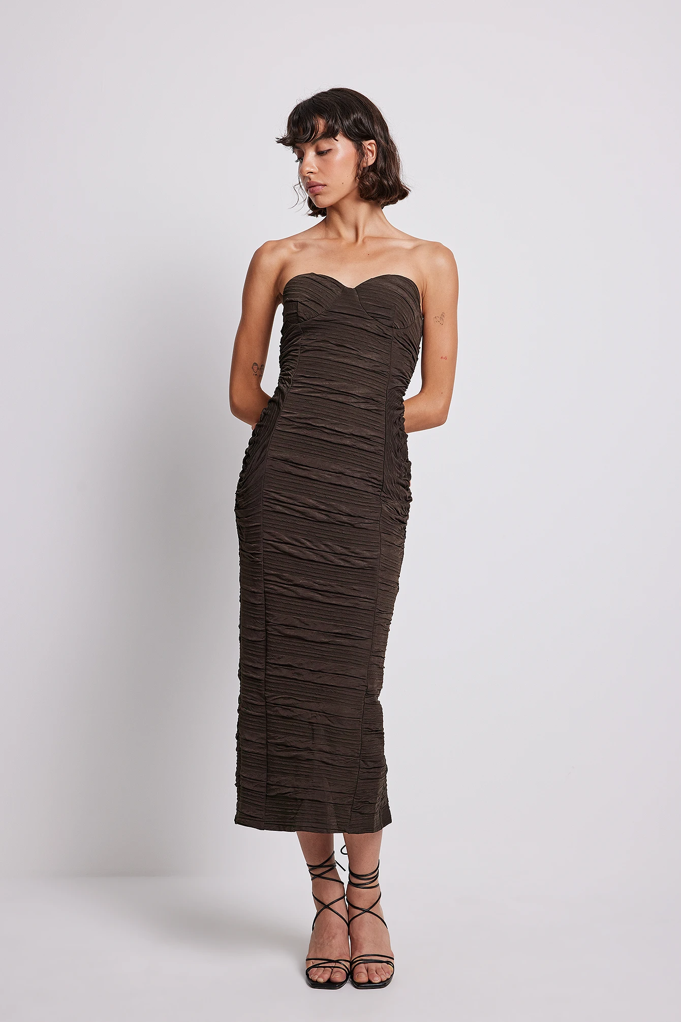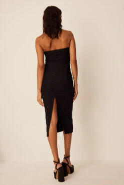 Cette robe midi est élastique et texturée et a des bonnets rembourrés, des couture latérale froncées et un détail fendu arrière.