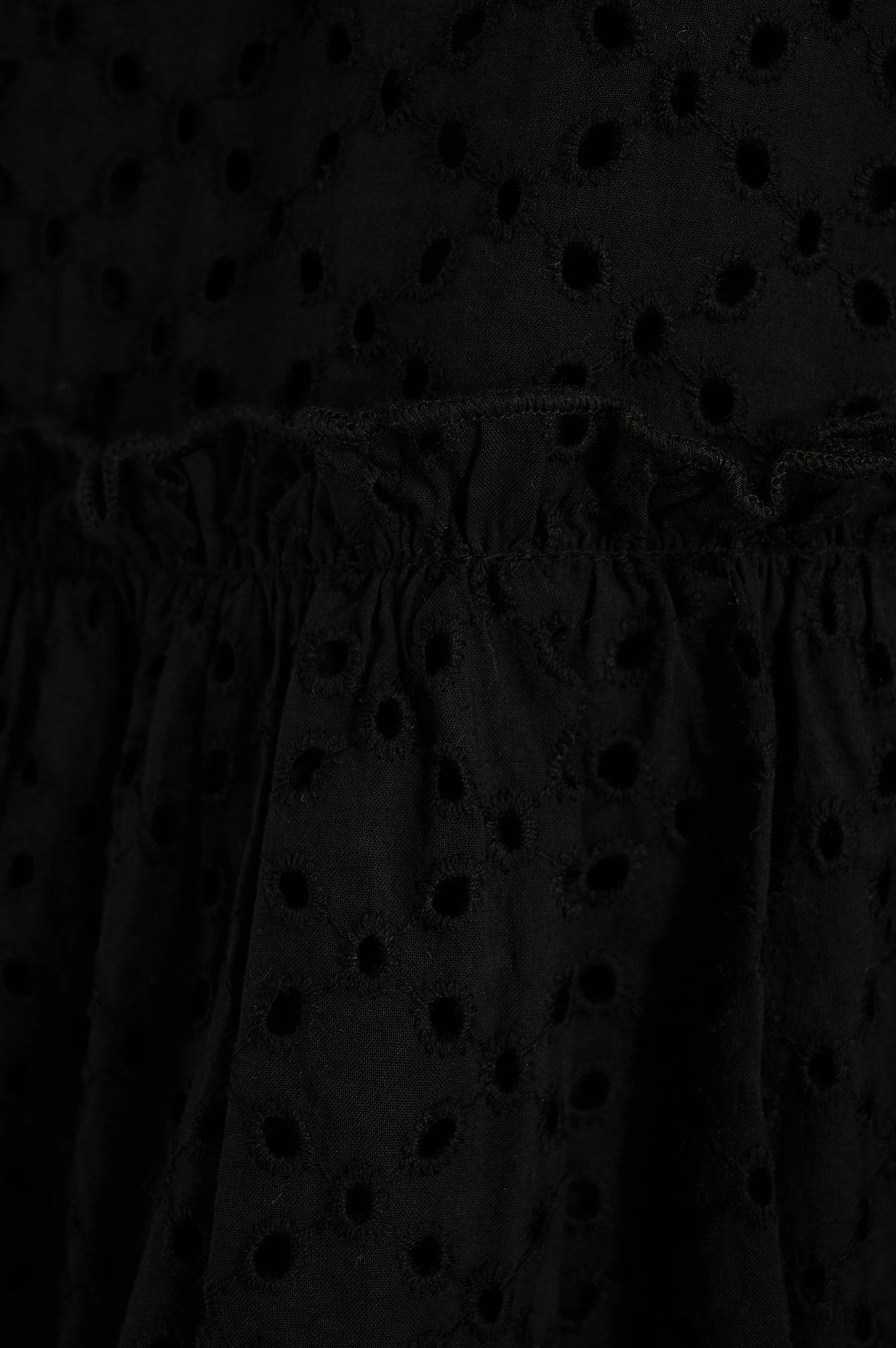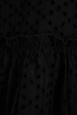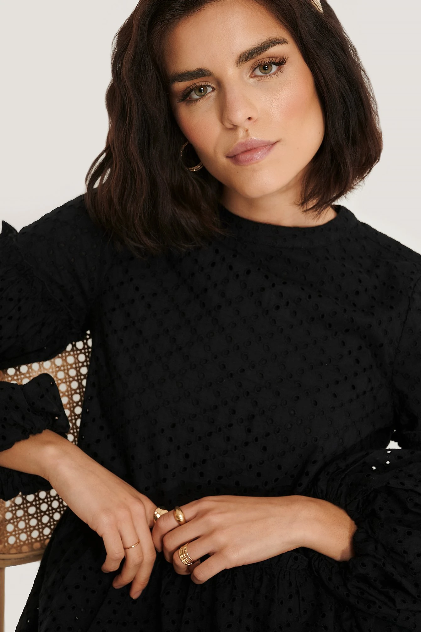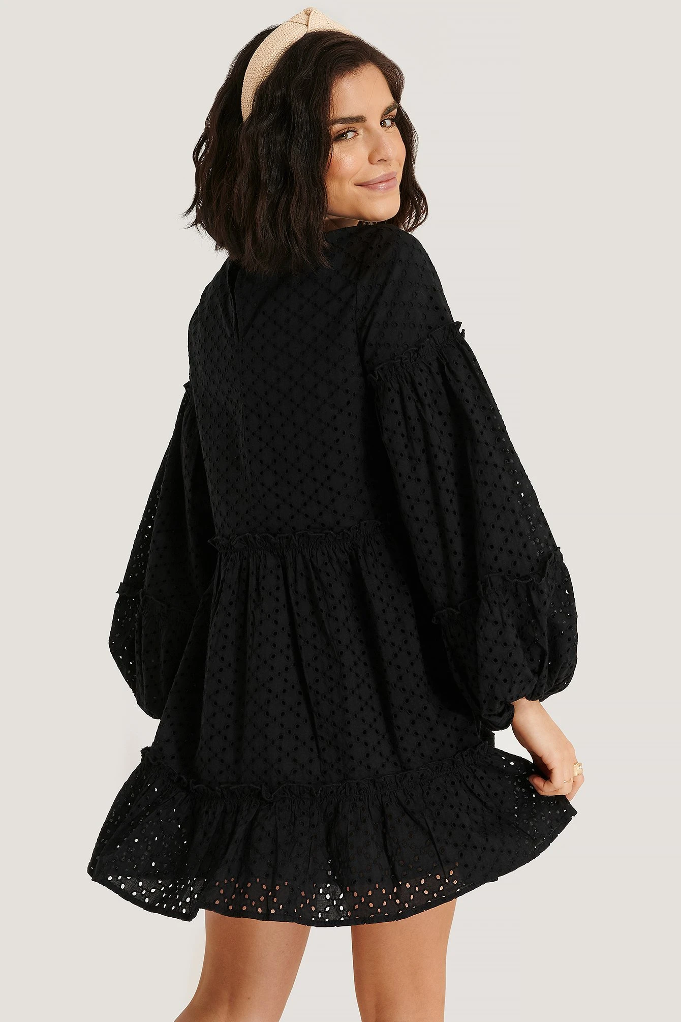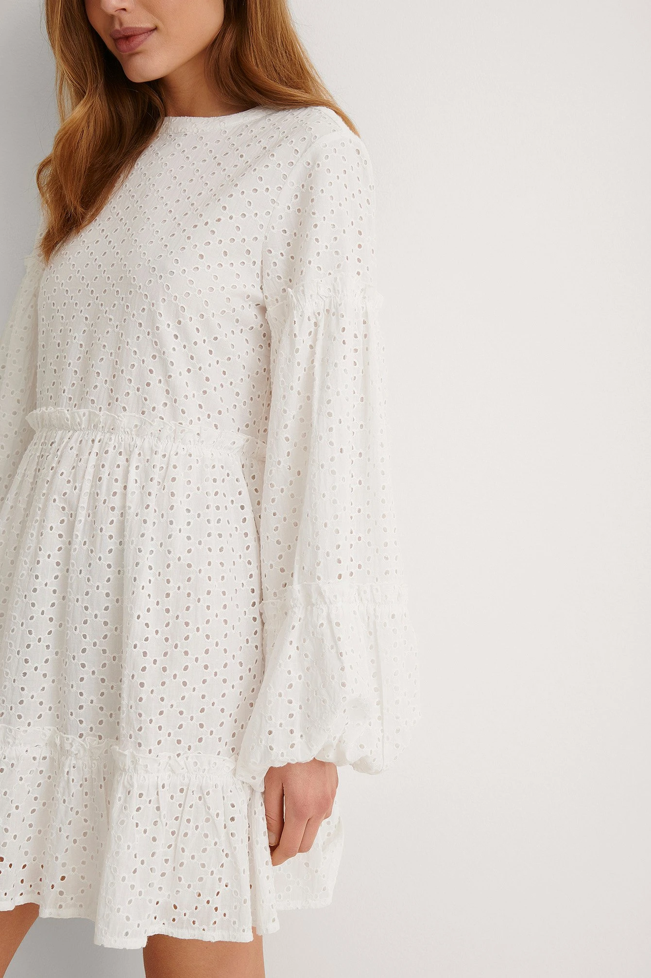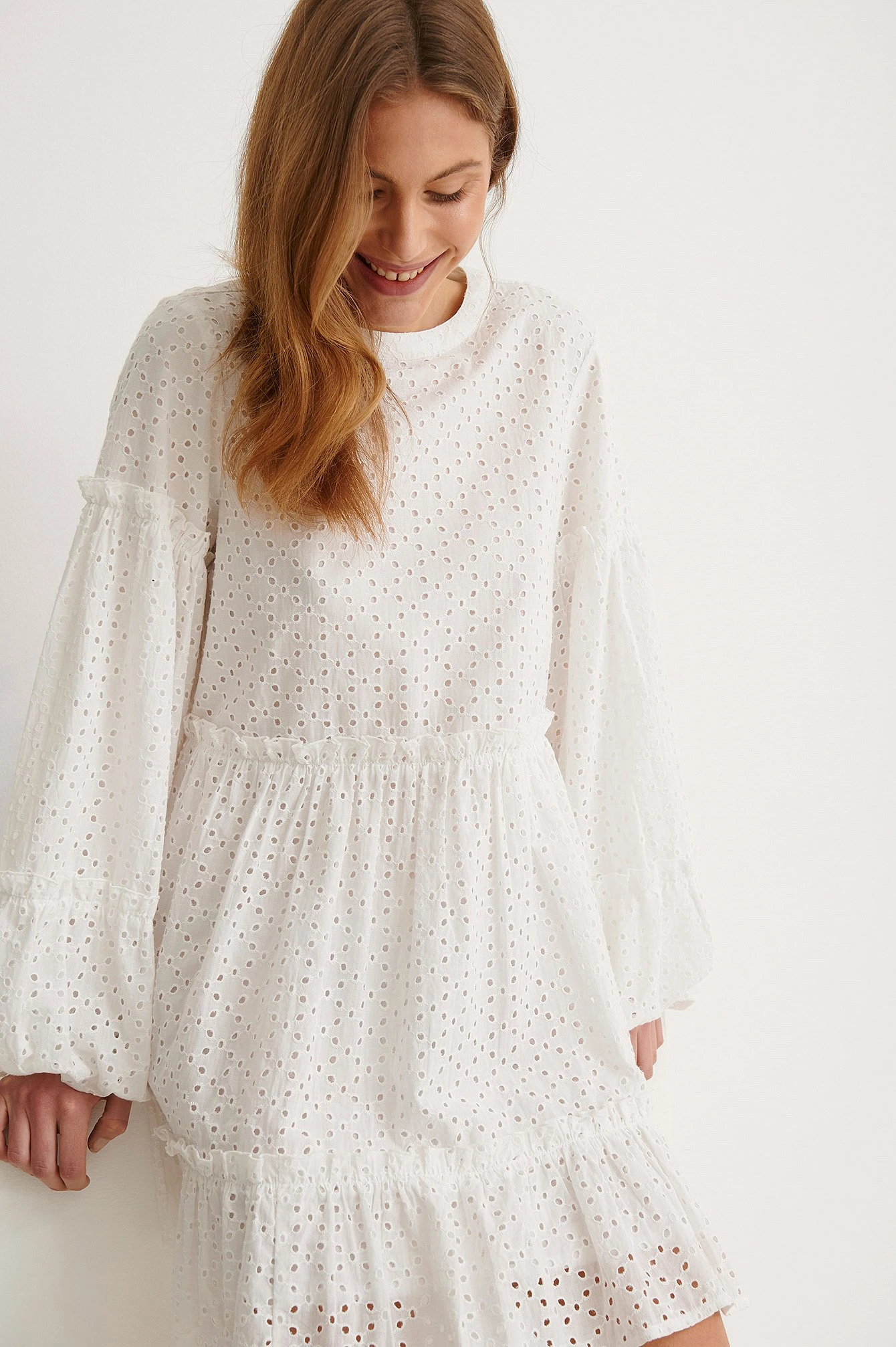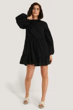 Cette robe courte a un col haut. Elle a une dĂ©coupe trou de serrure Ă l’arrière avec bouton de fermeture et des manches longues bouffantes. Cette robe courte a de la broderie anglaise, des dĂ©tails Ă volants et une doublure intĂ©rieure.